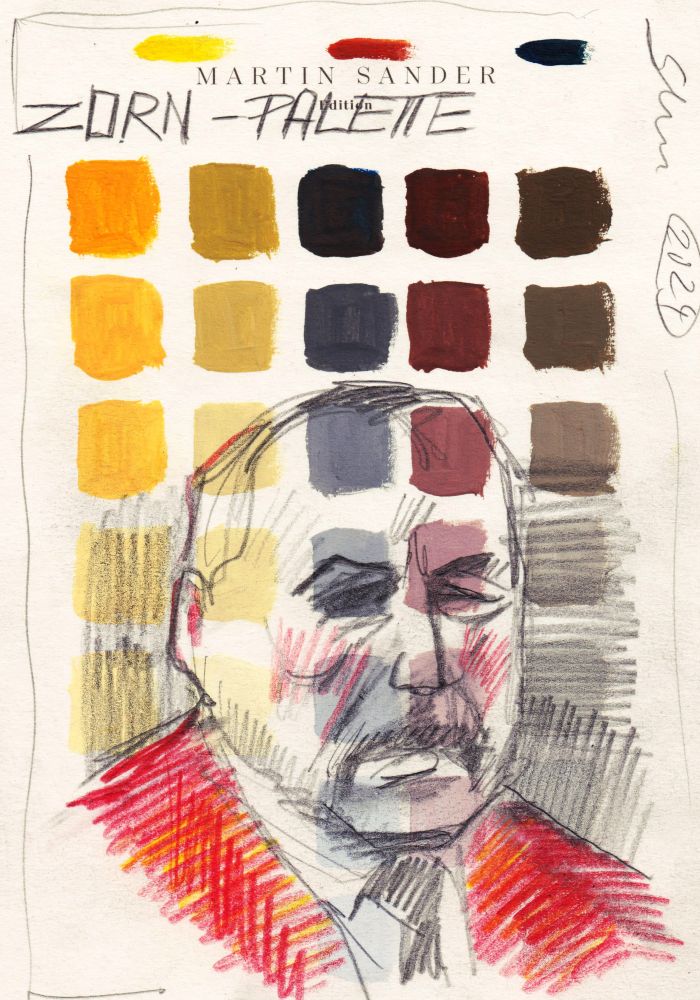 Anders Zorn war ein berühmter Maler um 1900. Er entwickelte die „Zorn-Palette“, die mit nur zwei Farben plus Schwarz und Weiß funktioniert. Mit den zwei Farben läßt sich eine erstaunliche Vielfalt von ungewöhnlichen Farbtönen mischen, weshalb diese Palette noch heute von vielen Portraitmalern verwendet wird.